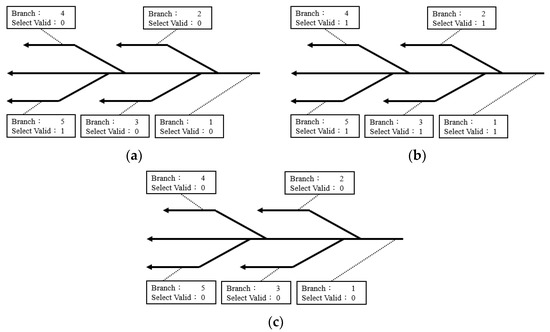 To enhance the learning efficiency of GAs, researchers usually use random functions to generate the initial generation to ensure the individuals are evenly spread throughout the feasible region. This is an effective approach because the values under consideration are usually independent [61]. However, this approach can produce (1) solutions with discontinuous water supply conditions and (2) solutions with total water usage outside of the range set by the user. The first case is illustrated in Figure 5a, where the 1 and 0 on each branch represent values generated by a random function. We can clearly see that water should be allocated to Branch 5, but water cannot reach Branch 5 from upstream (Branch 1). The second case is illustrated in Figure 5b,c, where we assume that decision-makers allocate 30~50% of the water allocated in previous years. Again, the 1 and 0 on each branch indicate whether water is allocated. In Figure 5b, the values on all of the branches are 1, which means that the total water demand is far greater than the available water amount. In contrast, the values on all of the branches in Figure 5c are 0, so the total water demand is again not within the set range.