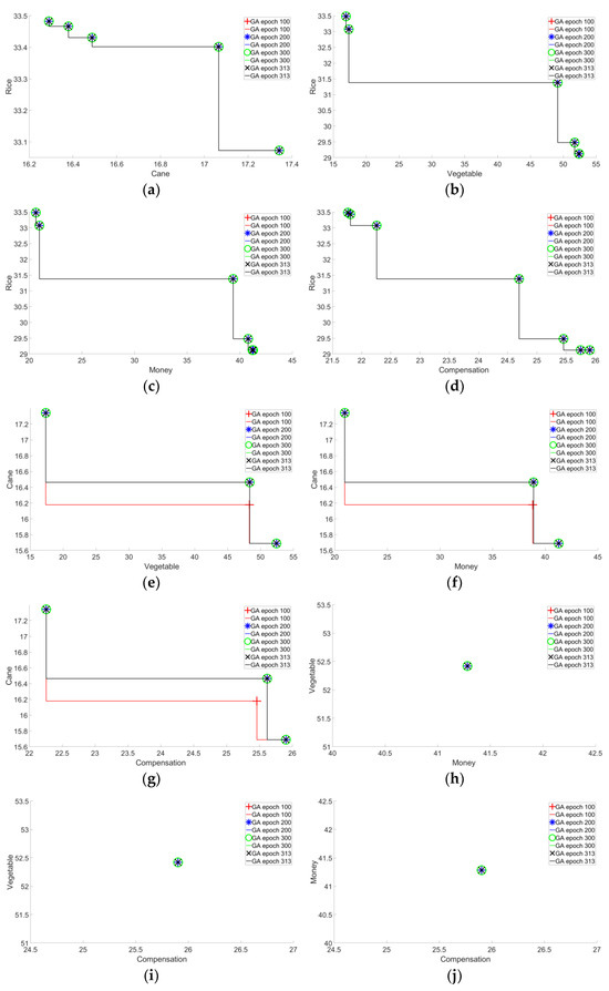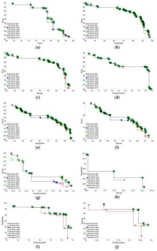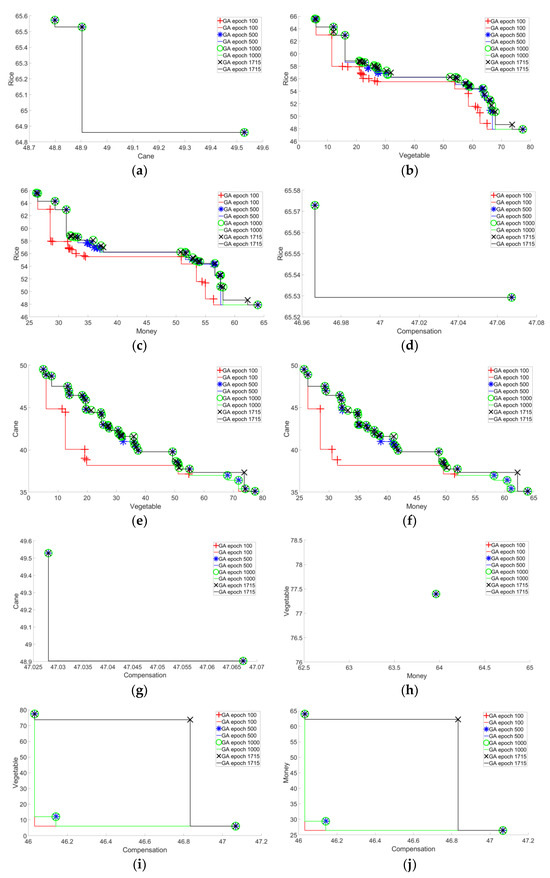 Comparisons of temporary skyline results obtained using the GA from different numbers of generations with water supply rates of 0~25%: (a) rice and sugar cane, (b) rice and vegetables, (c) rice and economic benefits, (d) rice and compensation, (e) sugar cane and vegetables, (f) sugar cane and economic benefits, (g) sugar cane and compensation, (h) vegetables and economic benefits, (i) vegetables and compensation, and (j) economic benefits and compensation.