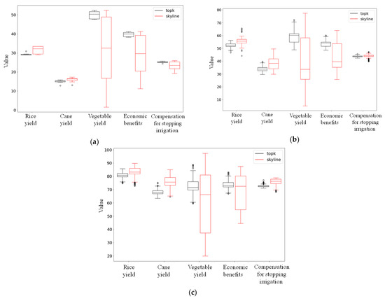 In this section, we compare the results of the proposed algorithm to those of a top-k query. We consider the irrigation system depicted in Figure 2, and the six feasible solutions under consideration by the government are presented in Table 1. In a skyline query, each solution is regarded as a data point. Thus, we selected only three objective values (rice yield, cane yield, and vegetable yield, which were calculated as discussed in the previous section) so that we could plot the results in a three-dimensional (3D) format. A skyline query checks each objective value for the solutions in pairs, seeking solutions with at least one objective value that is not poorer than that in the other solutions (i.e., solutions that are not dominated by other solutions). For example, in Table 1, all of the objective values (i.e., rice yield, cane yield, and vegetable yield) in Solution 2 are poorer than those in Solution 1, so the system considers Solution 2 to be dominated by Solution 1 and, thus, removes it. Visually, in Figure 3a, Solution 2 is below and to the left of Solution 1. Solution 1 has a smaller cane yield than Solution 3 but performs better than Solution 3 in the other two objectives. Thus, Solutions 1 and 3 do not dominate each other, meaning that both are feasible. Overall, Solutions 1, 3, and 5 are not dominated by any of the other solutions: Solution 1 is the best solution for rice yield, and Solutions 3 and 5 are the best solutions for cane and vegetable yields, respectively. Clearly, all three of these solutions meet government needs.