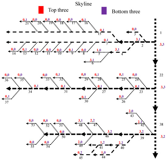A skyline query is a multi-condition query algorithm [12,13,52,53,54,55]. If users give the algorithm multiple conditions and a database, they will be able to identify all of the data points that meet at least one of their conditions from the database. Skyline queries are superior to top-k algorithms, which can produce solutions that meet none of the users’ conditions.