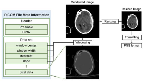 Using the metadata from Figure 1, pixel-formatted images are adjusted for brightness and contrast by windowing [] with window center, window width, intercept, and slope data, emphasizing ICH more clearly. Subsequently, the images are resized to 224 × 224 (width × height) dimensions, and then formatted into PNG. The labels are modified, with normal brain CT images assigned 0, and ICH subtypes of brain CT images assigned 1. Due to a significant difference in the number of normal brain CT images (640k) and images with the presence of ICH (107k), there is a potential for bias in the training data. Therefore, we randomly selected 150k normal brain CT images and trained the model alongside images containing ICH. Out of the total 257,932 images, 145,807 were used for training, 48,362 for validation, and finally, 64,483 for assessing the model’s accuracy. This approach allows us to train the model without bias in the training data and validate and evaluate its performance effectively.