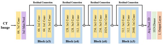 - ResNet-50V2 is a lightweight and efficient model compared to its predecessor, ResNet-50. It utilizes residual connections to improve the learning process by adding skip connections, which add the feature maps extracted from the previous layer to the input of the next layer. This increases the depth of the network, showcasing improved performance during the training process. The architecture of ResNet-50V2, depicted in Figure 4, incorporates pretrained weights that enhance the performance in training with low-resource data, making it adept at feature extraction for untrained data such as medical images. The hyperparameters used in ResNet-50V2 are as follows: the initial layer consists of a 2D convolution layer with a 7 × 7 kernel size and 64 filters, followed by batch normalization and ReLU activation functions. Subsequently, a 3 × 3 max-pooling layer with a stride of 2 is added. The following layers include four residual blocks. The first block has 64 filters and a stride of 2, the second block has 128 filters and a stride of 2, the third block has 256 filters and a stride of 2, and the fourth block has 512 filters with a stride of 1.