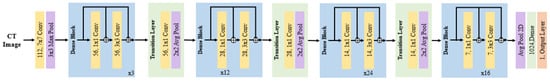 Figure 5. DenseNet-121 architecture, all convolutional layers within the dense block are densely connected by concatenation until they input into the transition layer. - VGG-16 consists of 16 layers, comprising 13 convolution layers and 3 fully connected layers. The distinctive feature of VGG-16 is its deep structure and the use of small filter sizes. VGG-16 is a simple yet powerful model primarily employed in computer vision tasks, capable of extracting rich features due to its very deep network architecture. This feature extraction ability enables the detection and extraction of various features of ICH, deriving relevant information. The architecture of VGG-16 is depicted in Figure 6, and the hyperparameters used are as follows: all convolution layers have a 3 × 3 kernel size with ReLU activation functions applied. Max pooling layers reduce the size of feature maps using a 2 × 2 kernel with a stride of 2. The fully connected layer consists of three dense layers with ReLU activation functions.