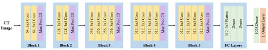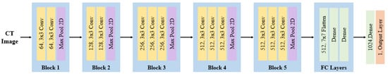 Figure 6. VGG-16 architecture. - VGG-19 is a model with a structure similar to VGG-16, but it has a more complex architecture with additional layers, allowing it to learn more intricate features. It consists of 19 layers, with an additional convolution layer in each of the third, fourth, and fifth blocks compared to VGG-16. The inclusion of these three extra convolution layers in VGG-19 enables it to learn more complex features of ICH and recognize a greater variety of detailed patterns. The architecture of VGG-19 is illustrated in Figure 7, and the hyperparameters used are as follows: it comprises 16 convolution layers with 3 × 3 filter sizes and 3 fully connected layers.