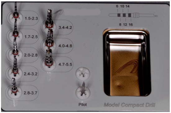 Forty-eight implant sites were prepared using osseodensification drills (Model Compact Drill, provided by FMD (Falappa Medical Devices, Rome, Italy)). The procedure was performed according to the sequence recommended by the manufacturer and considered a series of four steps for each osteotomy, starting with a pilot bur with a diameter of 1.7 mm. This was followed by the passage of the first conical bur of 1.5–2.3 mm diameter, with a pumping movement until the expected working depth was reached. We proceeded with the passage of progressive cutters, such as 1.7–2.5 mm and 2.0–2.8 mm, to end with the passage of the last cutter: 2.4–3.2 mm. The simultaneous irrigation of the site (90 mL/min with distilled water at room temperature (20 ± 1 °C)) with saline during the preparation of the osteotomies avoided alterations of the foam block due to the thermal damage induced by mechanical overheating; it is also functional in the formation of a continuous hydrodynamic pressure wave that favors the compaction of the bone chips. The steps were the same for all groups and both techniques. The same operator performed every osteotomy (Figure 2).