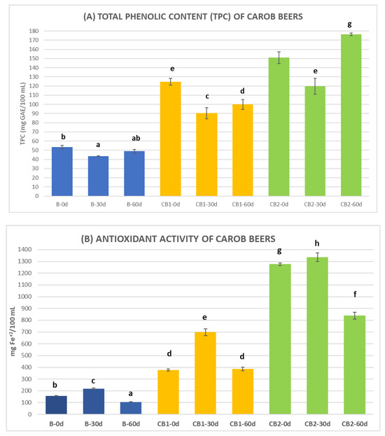 Beer presents significant antioxidant activity mainly attributed to the phenolic compounds originating from barley and hops [38,39,40]. The dark ale beer 6% ABV (B-60d) produced in this study had a total phenolic content of 48.9 mg GAE/100 mL at the end of the second fermentation (Figure 4). Similar studies have shown that dark beers had a minimum TPC content of 300 mg GAE/L and that dark beers had higher TPC than pale beers due to the greater presence of malted barley and the generation of polyphenols during the malting process [41]. However, it was shown that the addition of carob syrup significantly increased the bioactivity of carob beers. The strong dark ale carob beers had significantly higher total phenolic content, antioxidant activity, and antiradical activity compared to the dark ale beer without carob (Figure 4). More specifically, the carob strong dark ale with 8% ABV (CB1), after the second fermentation (60 days), had total phenolic content (99.9 mg GAE/100 mL), antiradical activity (129.0 mg TE/100 mL), and antioxidant activity (387.0 mg Fe2+/100 mL), which was higher by approximately two times, four times, and three times, respectively, compared to the respective values of the standard dark ale (6% ABV) without the addition of carob syrup (48.9 mg GAE/ 100 mL, 31.7 mg TE/100 mL and 105.4 mg Fe2+/ 100 mL). The carob strong dark ale with 10% ABV (CB2) after 60 days of fermentation had total phenolic content (176.4 mg GAE/100 mL), antiradical activity (206.6 mg TE/100 mL), and antioxidant activity (838.2 mg Fe2+/100 mL), which was higher by more than three times, six times, and eight times, respectively, compared to the respective values for the standard dark ale (6% ABV) without the addition of carob syrup.
