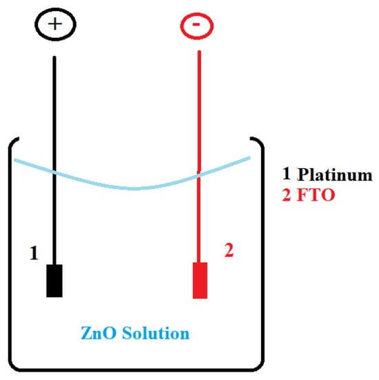 - The electrophoretic deposition took place in a simple two-electrode cell, with FTO serving as the anode and platinum as the cathode. The volume of the ZnO suspension in ethanol was 50 mL. Deposition occurred at applied voltages of 60 V, 70 V, and 80 V, with deposition times of 3 and 5 min, for each voltage. Figure 1 shows the scheme for cathodic deposition.