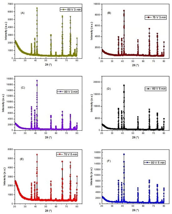 XRD analysis for the deposited films at (A) 60 V and 3 min; (B) 70 V and 3 min; (C) 80 V and 3 min; (D) 60 V and 5 min; (E) 70 V and 5 min; and (F) 80 V and 5 min.