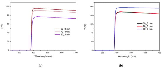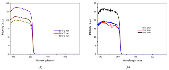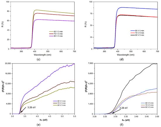 Figure 4a,b show the transmittance values for the films deposited at 3 and 5 min, respectively. All the EPD films exhibited high transmittance in the visible range of the spectrum, ranging from 75 to 95%, and very low transmittance values in the ultraviolet spectra, where photon absorption and the transition from the valence to conduction band occur. The films deposited at 5 min exhibited superior transmittance quality, particularly evident at 80 V, where it increased from 75% for the films deposited at 3 min to 95% for the films deposited at 5 min, representing a 20% improvement with a longer deposition time. However, at 60 V, the transmittance decreased for the films with an increased deposition time, suggesting increased light absorbance.