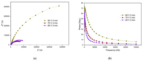 Electrochemical impedance spectroscopy was employed to examine the interfacial charge behavior of the dye cells, illustrated through Nyquist and Bode plots in Figure 5. In Figure 5c, semicircles are evident in the high-frequency region, indicating resistance to charge transport at the interface between the electrolyte (3I-/I-3) and platinum, thereby impacting the overall cell resistance. Notably, cells with thin films deposited for 3 min (Figure 4a) exhibit higher resistance [38].
