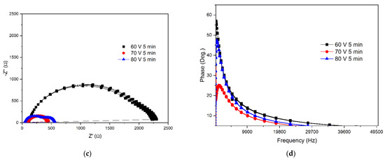 (a) Nyquist plot for the 3 min deposition time; (b) Bode plot for the 3 min; (c) Nyquist plot for the 5 min; and (d) Bode plot for the 5 min deposition time.