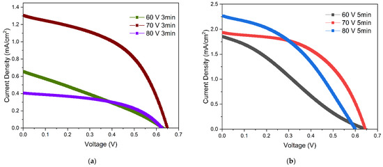 J-V data of the EPD films at (a) 3 min (b) 5 min deposition time.