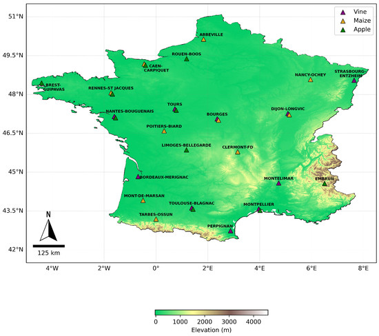 France is the leading producer of grain maize and the second largest producer of silage maize in Europe [36]. Maize is a summer crop; its growth and development are primarily influenced by temperature. In France, maize is the main irrigated crop, representing around one third of irrigated areas [37]. This is due to maize’s high sensitivity to drought and water deficit, particularly during the stages of reproductive development.