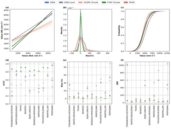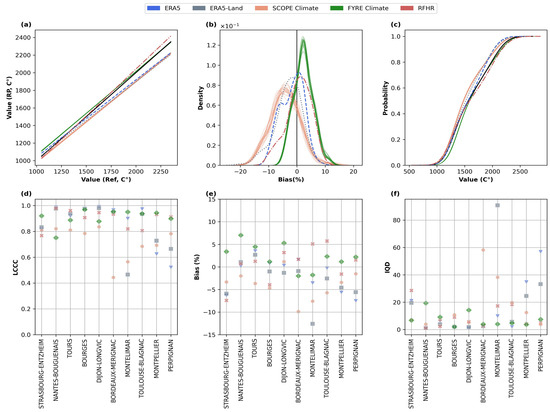 Regarding the DDs indicator, FYRE Climate displays the highest correlation with the reference dataset with a global coefficient of 0.9 and coefficients greater than for of stations (Table 3 and Figure 5d). The rest of the RPs exhibit relatively weaker correlations, with RFHR performing slightly better in reproducing DDs values. LCCC values for RFHR remain quite acceptable, with a global value of and correlations greater than for of the stations—a notable improvement compared to ERA5, ERA5-Land, and SCOPE Climate, where only of stations exhibit similar correlations. The same findings are shown by IQD values (Figure 5c,f). FYRE Climate is the closest to the reference dataset, with a global IQD of , followed by RFHR and SCOPE Climate. ERA5 and ERA5-Land show poor performances with an IQD greater than 3 in most cases.