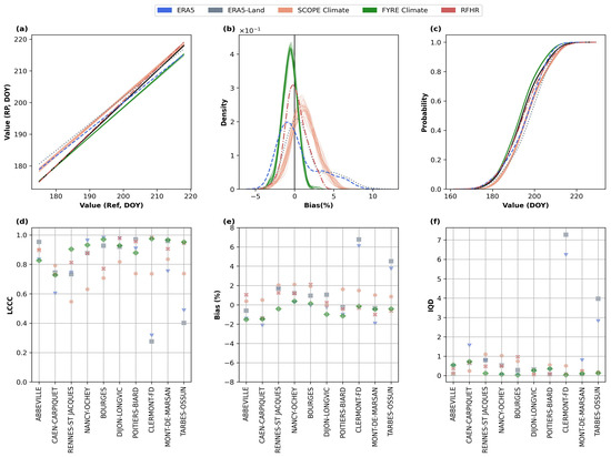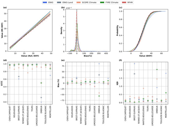 For DB indicator, strong correlations between all RPs and the reference dataset are observed (LCCC values , Table 3). For most stations, the LCCC values between the RPs and the reference dataset are high. The ratio of stations with LCCC values greater than is , , , , and for SCOPE Climate, ERA5, FYRE Climate, ERA5-Land, and, RFHR respectively (Figure 6d). Regarding the PBias, RPs exhibit, on average across all sites, values ranging between and (Table 3). Compared to RFHR, the KDE curves of the other RPs show a large spread, suggesting a higher variability (Figure 6b). For example, ERA5 overestimates the DB date by more than . Figure 6c shows good agreement between the cumulative probability distributions of RPs and the reference dataset. The IQD values also suggest a similarity between the RPs and the reference dataset, with values below in most cases (considering all stations and RPs) (Figure 6f).