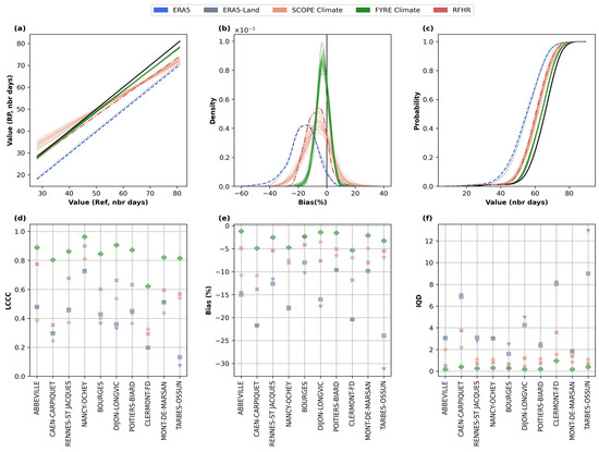 The correlations between observed and RP-derived values of FD are relatively strong for all products, with RFHR and FYRE Climate showing the highest correlations with the reference dataset (Table 3). Good agreement between RPs and the reference dataset is also seen for the study sites, with LCCCs greater than for of cases (considering all stations and all RPs) (Figure 4d). IQD values further confirm the previous results. A comparable agreement between the RPs and the reference dataset is seen on both global and local scales (Table 3 and Figure 4c,f). Overall, RPs display minimal biases (Figure 4b). Figure 4e illustrates that, on a local scale, the bias values remain insignificant, with values ranging between and , in most cases (considering all stations and RPs).