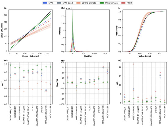 Results for the WI indicator over the 1996–2012 period between the reference dataset and each reanalysis product (RP): (a) Lin’s Concordance Correlation Coefficient (LCCC) plots, with the black line representing the 45-degree line (perfect agreement). (b) Kernel density estimation (KDE) of percent bias values. (c) Cumulative Distribution Function (CDF) of the reference dataset (in black) and each RP. For (a–c) the results concern all the studied sites collectively and the linestyles distinguish the RPs. (d) LCCC values separately for each study site. Idem for (e,f) with percent bias and integrated quadratic distance (IQD) values, respectively. For (e,f) the shapes distinguish the RPs.