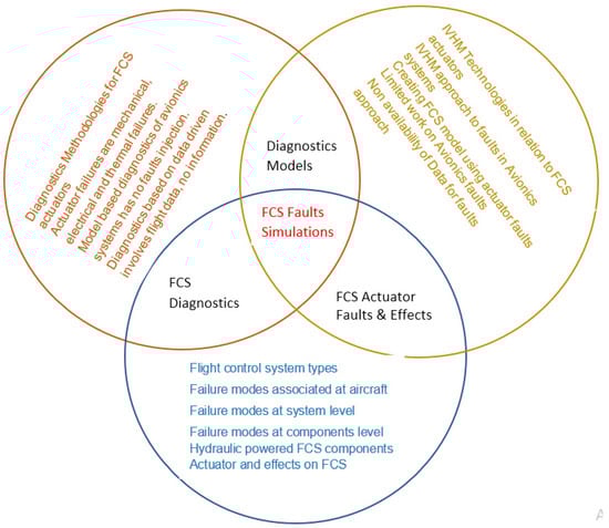 This paper is a follow-up part of the review of the HPFCAS to develop a model of the system []. It was initiated by simple experiments to determine the characteristics of the components. Also, it was used to obtain initial data that are used to create the model and subsequent simulations of faults. Some parts that constitute a build-up process have been documented and are shown in the Venn diagram of Figure 1. A brief recap of the previous work is given to explain the overall scale of the literature review work. The outcomes and the current contributions that enabled the scope of this paper were already published in a journal paper titled “A Review of Diagnostic Methods for Hydraulically Powered Flight Control Actuation Systems” [].