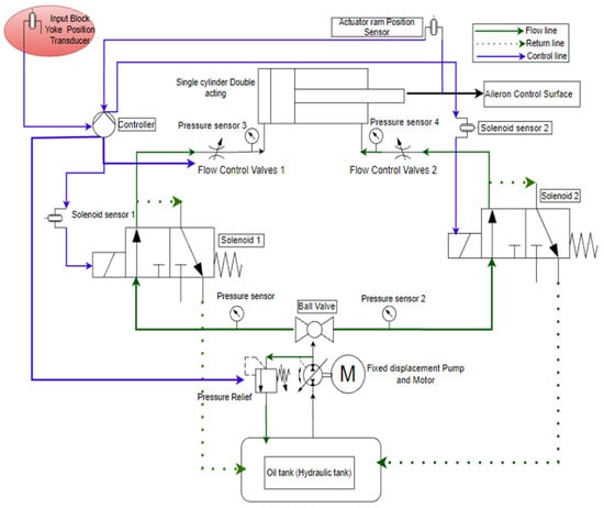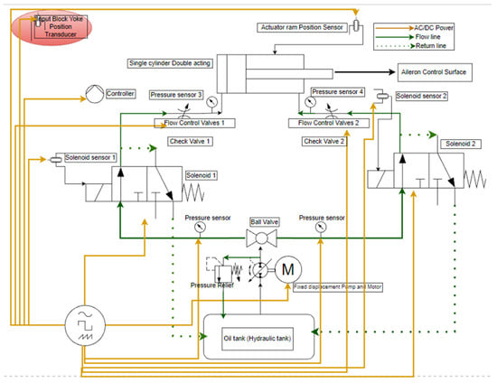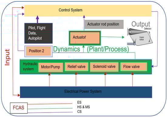 In Figure 2, the HPFCAS is viewed as an SOS block model with four subsystems and their individual models integrated. These are designated as the hydraulic, mechanical, electrical, and control subsystems. The model functions are grouped under a control system with the input, the plant/process, and the output. The main idea is to ascertain how the inputs obtained from any of the subsystems must be controlled and channeled into a hydraulically controlled circuit []. The hydraulic components basically are mechanical in nature. These are the fluid, the pipes, the valves, and the actuator and all its accessories used to generate the output.