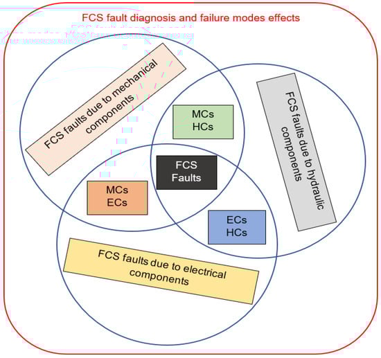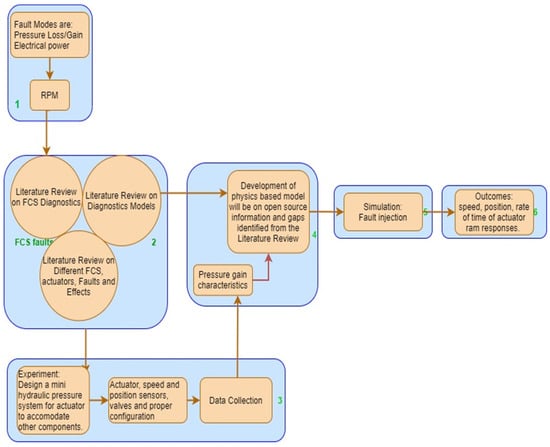 A literature review on fault and diagnostic processes for different FCASs shows variations in approaches. Of particular interest was the HPFCAS [] in one study, which established a suitable approach where the fault-finding challenges of multisystem configurations or integrations on an aircraft are separated into different systems. This is for a model-based diagnostic method and for a principal understanding of the physics of the HPFCAS system. That is, the models of the system will be developed with the physics-based knowledge of the separated subsystems. This must be well understood. However, accessing the historical data was problematic. Adequate data and algorithm development to match the HPFCAS diagnostic model were lacking. For hydraulic systems, any single system or component failure is a principal failure mode, as well as any combination of failures. Therefore, common-mode failures that can affect multiple systems are usually principal failure modes. These were designated as research gaps.