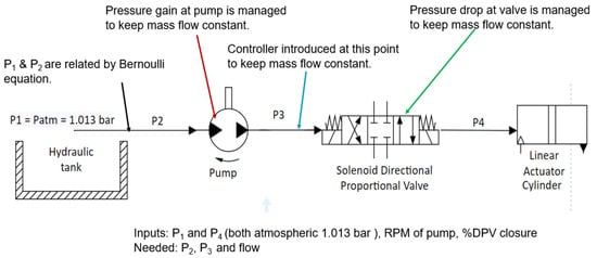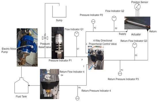 In the experimental process schematic, details of the component’s performance characteristics are required following the specifications provided by the component manufacturers. Therefore, the design of component integration and connection was made based on the interactions and conditions under which they would affect one another. This is developed as a process shown in Figure 4. This formation was created and integrated into computer graphical user interface (GUI) by the Software LabVIEW Version 2 provided by National Instruments (NI), which also serves as the platform for the main control subsystem. A hydraulic tank with liquid at atmospheric pressure was connected to a fixed displacement electric pump via pipes and connectors. A pressure relief valve and a four-way directional proportional valve (DPV) were connected to an actuator to complete the circuit with flow meters and pressure sensors attached to the connections. The details of these are explained in the section under simulations.