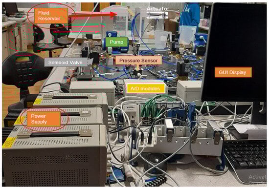 The rig contains two main tanks, each tank contains 30 L of fluid. One is the reservoir tank and another is a sump tank placed under the bench. Three gear pumps are driven by external motors, where only one is used at a time. One of the pumps was used to create fault injections during experimental simulations. A shut-off valve, a directional proportional valve (DPV), a laser sensor, four pressure sensors, and two flow meters are used. A National Instruments LabVIEW application is installed on the PC positioned in front of the rig to provide the control system as well as the GUI.