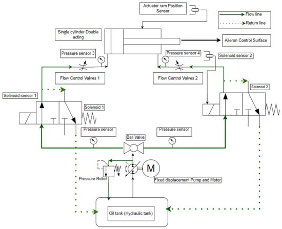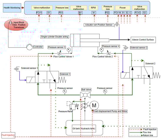 The main system for fault injection and diagnostics is the hydraulic system shown in green-colored lines. It consists of mechanical parts as components and a reservoir from which the fluid is pumped by an electrically powered motor pump at the required RPM. The fluid passes through the flow lines and a filter to the pump. This goes to the directional proportional valve (DPV). If control for opening the DPV is not initiated, excess pressure builds up due to the fluid flow; hence, a pressure relief valve is connected across the DPV to reduce excessive pressure. This allows flowback to the reservoir and acts as a safety measure for the pump.