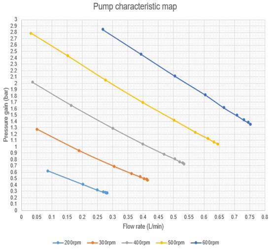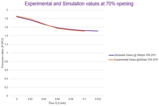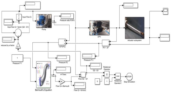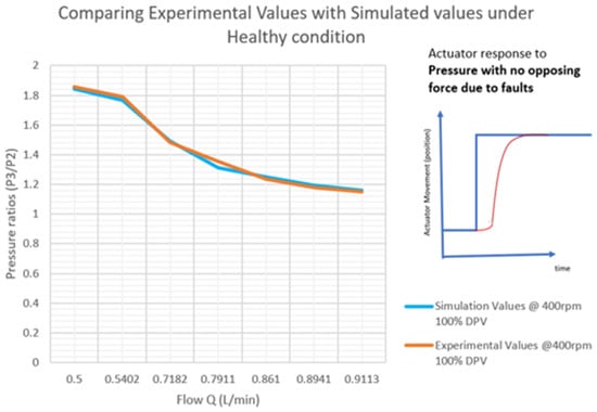 In the second stage as shown in Figure 6, the boundary conditions were established for the experiment, and the actuator was integrated upon successful completion of the mathematical calculations. Successive and repeated simulations were completed. Additional data were generated. The actuator rod displacement position, the pressure-changing values for a fixed pump speed, and the different values of pump speeds were noted. Both the experimental and the developed model simulations were run at intervals of 10 s in each case.