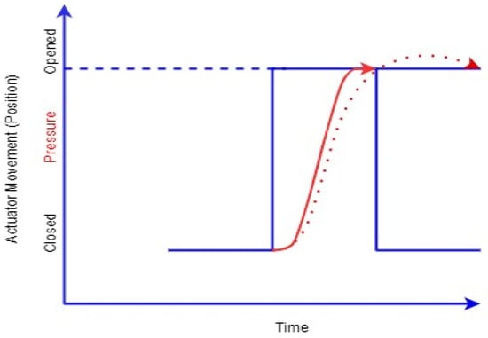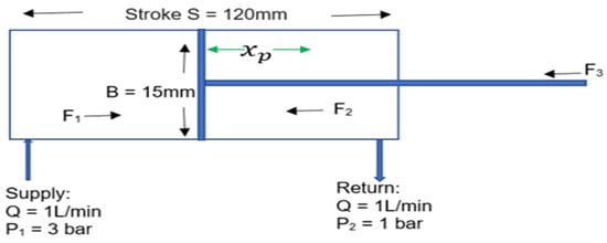 A mathematical calculation was applied from the Bernoulli principle []. Initially, a replacement for the linear actuator was completed with a fluid tank under atmospheric pressure to estimate the value of P4, and these provided two values of known pressures P1 and P4, respectively. The two remaining unknown pressure values, P2 and P3, were obtained using Bernoulli’s equation. Thereafter, the fluid tank was replaced with a suitable actuator that could withstand the pressure values at P4 for the simulation model.