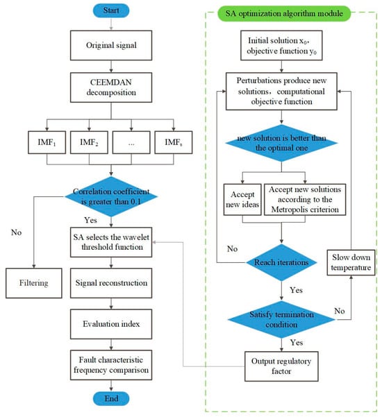 The wavelet threshold denoising algorithm and empirical mode decomposition denoising algorithm have found extensive application in noise processing for fault diagnosis. Xu et al. [2] proposed a denoising method for ECG signals, combining CEEMDAN and wavelet thresholding to effectively suppress random noise. Chen et al. [3] employed the wavelet thresholding method for initial vibration signal noise reduction. Subsequently, the denoised signal underwent decomposition and reconstruction via CEEMDAN, enhancing the recognition accuracy of rolling bearings with nonstationary vibration signals. Sun et al. [4] utilized CEEMDAN to decompose the cable signal and calculate the correlation. Components with high correlation were reconstructed, and the resulting signal underwent final wavelet noise reduction for effective noise filtration. Li et al. [5] conducted CEEMDAN decomposition of the original signal, breaking down the intrinsic mode function (IMF) into noise components, noise-dominant components, true signal-dominant components, and true signal components. Discarding the noise-dominant and real signal-dominant components, they reconstructed a noise-canceled signal with the genuine signal component, employing wavelet soft thresholding for noise reduction. Zhou et al. [6] applied CEEMDAN to decompose the blast vibration signal into IMF components, further categorizing them into major and minor components based on correlation coefficients. The denoising process involved fixed and soft thresholding techniques applied to the two groups of IMF. Abdelkader et al. [7] employed CEEMDAN to decompose the rolling bearing vibration signal, screening each IMF energy value, reducing wavelet noise in abnormal IMFs, and subsequently reconstructing the signal.
