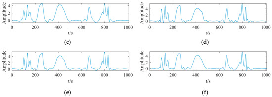 Comparison of noise reduction with various threshold functions. (a) Noisy signal. (b) Signal after improved threshold denoising. (c) Signal after soft threshold denoising. (d) Signal after hard threshold denoising. (e) Signal after improved threshold denoising in the literature [25]. (f) Signal after improved threshold denoising in the literature [26].