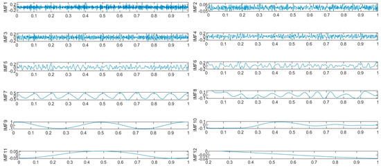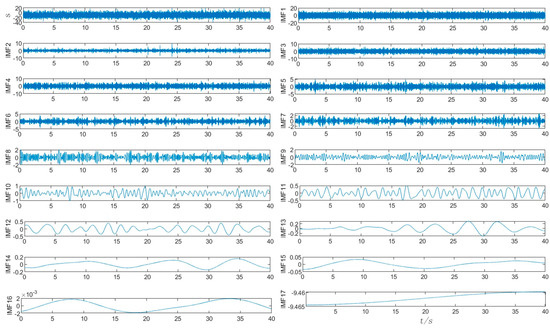 To simulate testing conditions, a random noise of 18 dB is added to the signal f(t), resulting in the simulated signal for testing. Subsequently, the signal undergoes CEEMDAN decomposition, and the decomposed IMF components are illustrated in Figure 5.