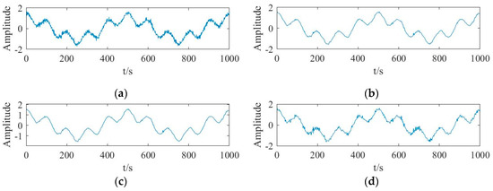 Comparison of the original noisy signal with the denoised signal. (a) Noisy signal. (b) Signal after CEEMDAN improved threshold denoising. (c) Signal after CEEMDAN soft threshold denoising. (d) Signal after CEEMDAN hard threshold denoising.