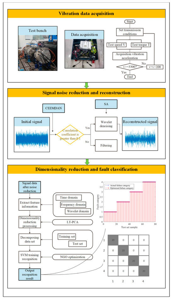 To effectively reduce the gearbox signal noise and improve the accuracy of fault recognition, this section proposes a gearbox fault recognition method integrating improved wavelet noise reduction, LT-PCA, and NGO-SVM. The method comprises three main components: signal noise reduction processing, signal fault feature extraction processing, and fault recognition. The following presents the detailed procedure of the integrated fault noise reduction and identification method.