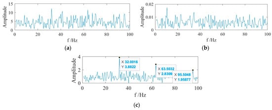 The energy spectrum of the signal with noise in Figure 15a,b reveals that the fault frequency is hidden in the noise, and the fault information cannot be accurately identified. However, direct wavelet denoising fails to clearly identify the characteristic frequency, leaving the actual fault frequency obscured and resulting in a less-than-ideal denoising effect. In Figure 15c, the proposed method’s decomposition and noise reduction unveil the characteristic fault rotation frequency and the frequency doubling of the planetary wheel, which can be extracted as follows: 32.0, 63.5, and 95.5 Hz. The characteristic frequency is obvious, and the energy value corresponding to it is prominent, nearing the theoretical calculation frequency. Thus, the noise reduction method is effective.