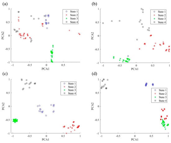 For wavelet domain features, as shown in Figure 16b, under normal PCA dimensionality reduction, the aggregation effect of data points is obvious for normal state and moderate fault cases, and the accuracy of analysis and diagnosis is high. However, for mild and severe fault categories, the proximity of data points makes it challenging to separate them, and the wide gap between data points of a single category increases the likelihood of misjudgment when determining the fault type. In the wavelet domain features under LT-PCA dimensionality reduction, as shown in Figure 16d, the aggregation of different fault datasets is more effective than ordinary PCA aggregation. However, light and moderate faults appear mixed, and fault categories cannot be effectively distinguished.