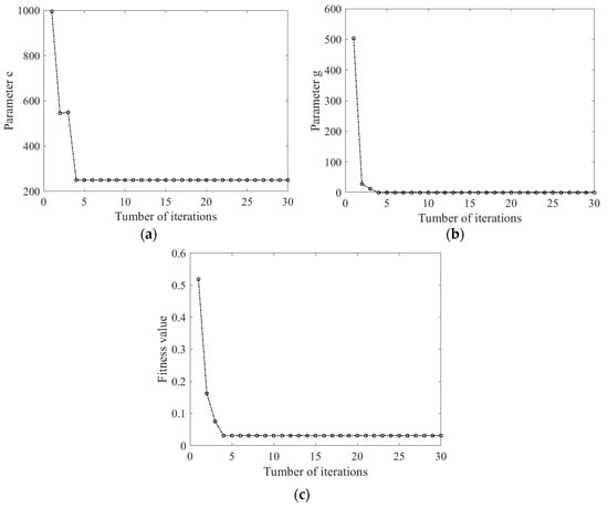 Optimization process and iteration curve of parameters ‘c’ and ‘g’. (a) Optimization process of parameter ‘c’. (b) Optimization process of parameter ‘g’. (c) Iteration curve.