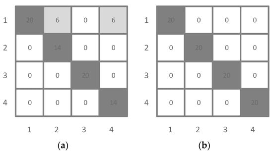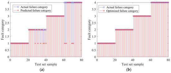 The confusion matrix (CM) is a valuable tool in machine learning and statistics for evaluating the performance of a classification model, offering a detailed perspective on how the model performs across different categories. Its primary purpose is to compare the model’s classification results with the actual categories, enabling the calculation of various performance metrics. When testing experimental data, fault diagnosis results are visually represented using the confusion matrix, as depicted in Figure 19. The horizontal and vertical coordinates of the figure, labeled 1, 2, 3, and 4, represent the four data categories, allowing for joint diagnosis of no fault, as well as mild, moderate, and severe faults. The rows of the graph represent true category cases, and the columns represent the predicted cases. For example, in column 2 of Figure 19a, where the horizontal coordinate is 2 (representing mild faults), 14 samples are correctly classified, and 6 samples are considered to be in the no-fault state, with an accuracy of 70%. Similarly, for the NGO-SVM, see column 2 of Figure 19b, where the classification accuracy is 100%. The classification prediction of the NGO optimization algorithm surpasses that of the original SVM algorithm.