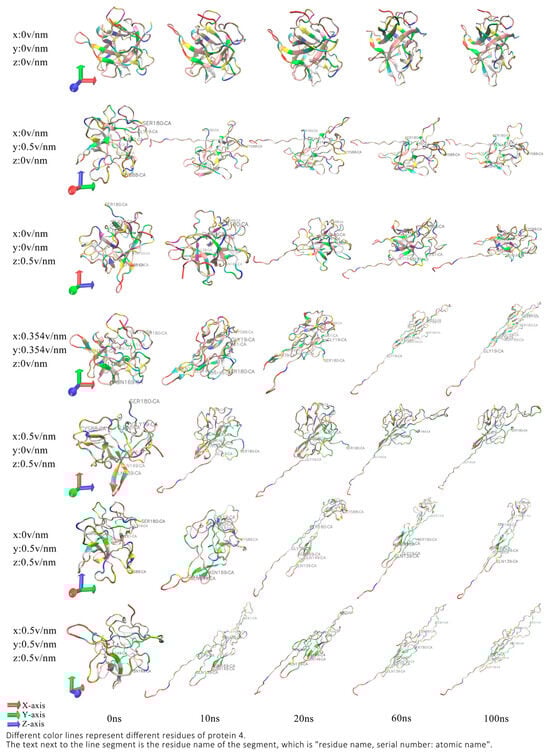 VMD (Visual Molecular Dynamics) is a molecule-based visualization application that displays, animates, and analyzes a variety of large-scale biomolecular systems through 3D images and built-in scripts [28]. We obtained Figure 1 by observing the molecular structure and molecular trajectory of proteins through VMD. In previous studies, authors have found that the secondary structure of the protein begins to change after applying an electric field of 0.5 v/nm in intensity in the x-axis direction, and the residues 4–19 gradually unfold and stabilize around 30 ns, and this study also successfully reproduced this conclusion [29]. Under the action of the 0.5 v/nm intensity electric field in the y-axis direction, the residues 4–19 of the protein also unfolded around 10ns, and the residues 139–149 at about 20 ns also began to deform until they were stable at about 60 ns. When the electric field acted in the z-axis direction, the protein conformation changed the same as the former except in the direction. When the 0.354 v/nm electric field was applied simultaneously in the x and y axis directions (the combined field strength was 0.5 v/nm, and the direction was 45 degrees from the x-axis to the y-axis), the protein also expanded the residues for the 61–88 and 169–180 base on the residues 4–19 and 139–149 and rotated because the VMD observation was the same when 0.5 v/nm was applied in each direction; therefore, the situation of 0.5 v/nm of the unidirectional electric field is not discussed in this article. When a 0.5 v/nm electric field is applied simultaneously on the x-axis and z-axis, the protein immediately expands the residues 4–19 at the beginning of the reaction, and the residues 139–149 and 61–88 are gradually expanded but do not rotate for about 30 ns. When the 0.5 v/nm intensity electric field is applied to both the y-axis and the z-axis electric field, the residues 4–19 and 139–149 are deployed along the y-z-axis, and the protein rotates, but the residues 61–88 have no clear conformational changes. When an electric field of the same size acts simultaneously in the direction of the three coordinate axes, the above three fragments have clear conformational changes and rotation.