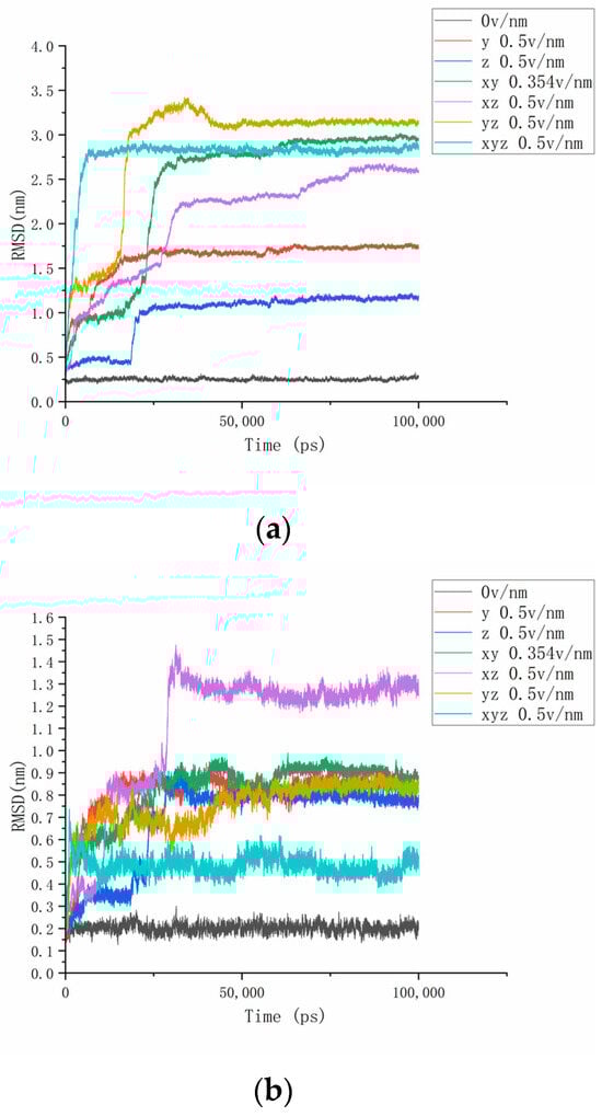 In this paper, the RMSD of the whole and partially changing fragments of the simulated protein under the action of electric fields in different directions is calculated, as shown in Figure 2, to study the conformational changes, stability, and convergence of the proteins during the simulation [30]. Firstly, we calculate the RMSD value of the protein in the 310 K, 0 v/nm state and set it as the reference value. According to Figure 2a, the RMSD reference value of the protein fluctuated at around 0.25 nm, and the overall dynamic was stable. After applying the electric field, the RMSD curve of the protein could be seen to shift, and the change was clear. This phenomenon indicates that the protein changes its original spatial position and the conformation changes under the action of the electrostatic field. In the above analysis, we observed that the secondary structure of some regions of the protein except residues 4–19 (residues 61–88, 139–149, 169–180 residues) also changed significantly. So, the RMSD parameter graph of residues 61–88, 139–149, and 169–180 under the action of electric fields in different directions was drawn.