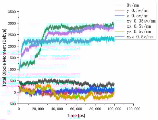In the study of changes in protein conformation via external electrostatic fields, the dipole moment parameter analysis of proteins is a very simple and intuitive method of analysis [31]. The dipole moment of a protein molecule is the product of the distance between the centers of positive and negative charges and the electricity carried by the center of the charge, which is a vector representing the polarity of the molecule. In the natural state, the molecular dipole moment presents as a random, disordered distribution state in the system. In this study, we applied an external electrostatic field so that the dipole moment of the protein molecule could couple with the direction of the applied electric field. From Figure 3, we can see that the dipole moment of the protein molecule without the action of the reference group (310 K, 0 v/nm) was stable at about 400–500 Debye. When the instantaneous dipole moment of the electric field was applied simultaneously in the x, y, x, and z directions, it increased rapidly until the dynamic stability was about 2800 Debye and 2600 Debye, respectively, about 30 ns after the simulation began. The results show that there was a significant coupling between the dipole moment and the direction of the electric field, which affected the behavior and conformational change in the protein in the electric field. When an electric field of 0.5 v/nm was applied to the x, y, and z axes at the same time, the growth amplitude and speed of the dipole moment increased significantly, and the reaction was complete within about 10 ns from the beginning of the simulation and remained dynamically stable at about 2250 Debye. It can be inferred that the electric field intensity had an effect on the coupling reaction speed of the electric field to the dipole moment. When the electric field intensity was strong, the coupling speed clearly accelerated, and the electric field with the same intensity in different directions had different effects. It is worth noting that when an electric field of 0.5 v/nm in size was applied to the y and z axes, respectively, or in the direction of both axes, the total dipole moment of the protein molecule decreased and fluctuated around the value of 0. The final equilibrium position was even negative when applied in both directions at the same time: a phenomenon that indicates that the protein may have a certain force in the y and z directions in the natural state. The intensity of the electric field in both directions does not cause a coupling reaction with a significant dipole moment, and some fragments may be more compact under the electric field. Combined with the different dipole moment convergence values of other experimental groups, it is not difficult to find that there are differences in forces and stability in different directions within the protein [32].