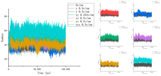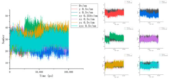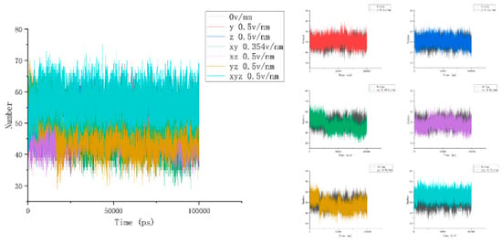 Proteins have a secondary structure because the peptide backbone hovers or folds according to a certain law in space, which is manifested as the α-helix, β-folding, β-corner, and Ω-rings and other structural conformations. Hydrogen bonds are molecular forces stronger than van der Waals’ forces formed via the covalent bonding of hydrogen atoms and electronegativity atoms in proteins with secondary structures. Since changes in the secondary structure of proteins lead to changes in hydrogen bonds inside and outside the proteins, this paper provides lateral proofs of conformational changes in proteins by analyzing and comparing the changes in the number and length of hydrogen bonds inside the proteins and between proteins and water after an applied electric field [33]. As can be seen from Figure 4, the number of hydrogen bonds inside the reference group (310 K, 0 v/nm) protein without an electric field is stable at around 120. The number of hydrogen bonds inside the protein decreases significantly after the electrostatic field is applied [24], which indicates that the original internal structure of the protein changes under the action of the electric field, and the hydrogen bond between the secondary structure begins to break. The change in the number of hydrogen bonds between the protein and water can be observed in Figure 5, and it is not difficult to find that the number of hydrogen bonds in this part changed and the number of hydrogen bonds in the protein changed in a complementary relationship. Taking the simultaneous application of the 0.5 v/nm electric field in the x, y, and z axes as an example, the number of intermolecular hydrogen bonds of proteins decreased to the minimum when the simulation started at about 10 ns. Correspondingly, the number of hydrogen bonds between protein molecules and water molecules increased to the maximum at about 10 ns; that is, the number of hydrogen bonds inside the protein decreased, and the hydrogen bond increased with the water because more hydrogen bonds are formed with the water molecules after the hydrogen bond breaks under the action of the electric field. In addition, the electric field’s strength also has an impact on the speed at which hydrogen bonds break and form. From Figure 4, it can be found that the drop time of the number of hydrogen bonds when applying a 0.5 v/nm electric field in one direction is around 30 ns. As the number of electric fields increases, the strength of the combined field becomes larger, the time for the hydrogen bond change in the protein is also shortened, and the decline time of the number of hydrogen bonds inside the protein is only about 20 ns when the electric field is applied to the two sides, while the decline time when the electric field is applied at the same time in the direction of the x, y, z coordinate axis is only 5–10 ns, and it can be seen that the strength of the electric field has a great impact on the conformational change rate of the protein.