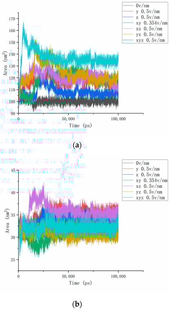 The previous article explored the formation of more hydrogen bonds between the hydrogen bond breaks inside the protein and the water molecule under the action of the electric field and found that the contact area between the protein and the water may change during the reaction. To explore the interaction between proteins and solvents, we continued to study the SASA of proteins to analyze changes in the protein–water contact area. We performed this by calculating the contact area change chart between the No. 4H9W protein and the three-segment residue (residues 61–88, residues 139–149, residues 169–180) and the water solvent, as shown in Figure 9. As can be seen from Figure 9a, the SASA value of the protein of the reference group (310 K, 0 v/nm) of this experiment was stable at about 100 nm2 without significant change, which proves that the protein has a certain force inside, so that it can maintain structural stability in the natural state and, thus, stabilize the contact area with water. Under the action of the electric field, the contact area of the protein as a whole with the water solvent increases sharply, and it is dynamically balanced at a certain value after 25 ns. It can be seen that the internal structure of the protein changes significantly under the action of the external electric field, and some areas become stretched or rotated from curling up to expanding so that the contact area with the water solvent increases. Since most of them are distributed on the surface of the protein, more active sites are exposed [36]. In addition, as the strength of the combined electric field increases, the change time of the contact area is significantly shortened, and the area growth rate increases significantly, which also matches the results of the previous analysis of the RMSD, dipole moment, and hydrogen bond. In combination with the protein RMSD curve in Figure 2a, it is not difficult to find that the curves of different parameters under the same electric field change at the same speed. Taking the electric field of 0.5 v/nm applied simultaneously in the x, y, and z axes as an example, the RMSD and SASA parameter curves of the proteins both increased to the highest within 10ns after the simulation began and then tended to be stable. Figure 9b–d calculates the SASA values of residues 61–88, 139–149, and 169–180, respectively, and we found that the SASA parameter changes in some protein fragments were slightly different from the overall characteristics discussed above. Taking residues 61–88 as an example, we could see that the contact surface of this segment of the residue with the aqueous solvent mostly significantly increased after different electric fields were applied, indicating that the deformation of this protein fragment under the action of the electric field exposed more hydrophilic regions. In particular, when an electric field of 0.354 v/nm was applied simultaneously in the x, y-axis direction, the SASA value of this fragment dropped to a certain extent before it began to grow and exceed the reference value, indicating that residues 61–88 in this state may shrink to a certain extent and then expand. In the RMSD and hydrogen bond parameter curves of residues 139–149, the parameters in this direction electric field were the most active. By observing Figure 9c, it can be found that the SASA change in residues 139–149 under the action of the electric field is not drastic, and the same change in the number of hydrogen bonds is also the overall upward movement of the curve, which proves that the conformational change in this protein fragment is not clear. In contrast, the SASA value of residues 169–180 in Figure 9d did not increase but decreased under the action of some electric fields, which also confirmed the anisotropy inside the protein and the influence of disulfide bonds.