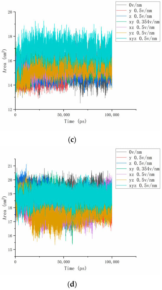 (a–d) Represents the SASA numerical curves of protein No. 4H9W, residues 61–88, residues 139–149, and residues 169–180 under different amounts and directional electric fields.