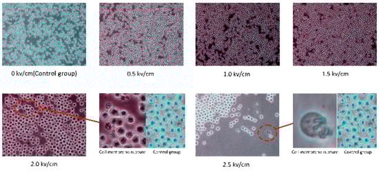 In this paper, the structure of myeloma cells was observed many times under different levels of electric field intensity. The control group did not apply the pulsed electric field, and the five experimental groups applied a pulsed electric field of 0.5 kV/cm, 1 kV/cm, 1.5 kV/cm, 2 kV/cm, and 2.5 kV/cm. Under the electric field intensity of 0.5 kV/cm, 1 kV/cm, and 1.5 kV/cm, the structure of myeloma cells did not change significantly, as shown in Figure 11. When the pulsed electric field intensity was 2 kV/cm and 2.5 kV/cm, the cell membrane structure of some myeloma cells was broken. The results show that when the pulse electric field intensity reaches 2 kV/cm, the electric field has a clear effect on the phospholipid membrane structure.