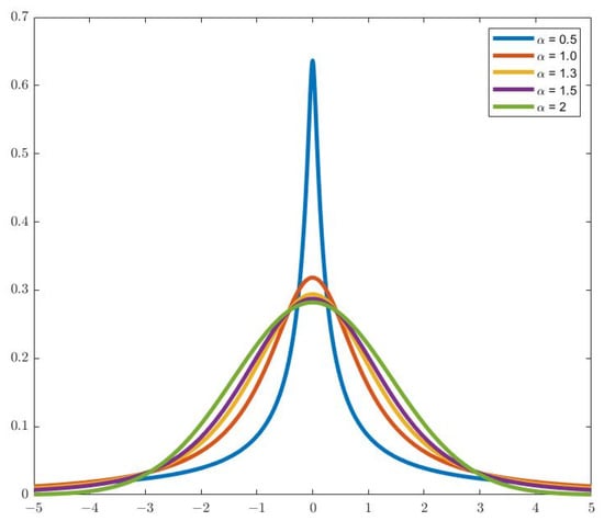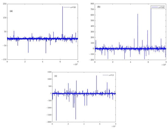 Many everyday situations give rise to impulsive noise. Impulse noise is an unexpected, sharp sound that occurs instantaneously over the course of time. Figure 3 illustrates noise signals with varying intensities under different α values of the α-stable distribution. As observed in Figure 3, a decrease in α leads to increased amplitude and discrete changes in the noise signal, thereby complicating the convergence of algorithms.