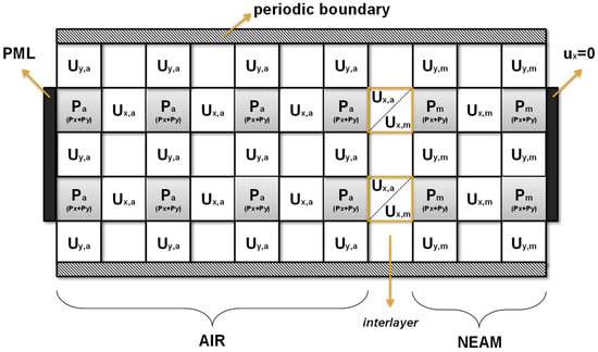 To solve Equations (18) and (21), a classic FDTD method can be used, approximating the partial derivatives on constitutive equations using central finite differences schemes with staggered grids for the pressure and the particle velocity vector, both in space and time [30,31,32]. For example, in a 1D space along the X-axis, NEAM and domain momentum in Equations (18) and (20), respectively, with a first-order error, yield the next FDTD update equations