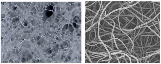 Microscopic kernel differences on the studied materials, although the computed behavior is macroscopic. Left: Melamine foam (image by the authors); Right: PET fiber, from [38] gently provided.