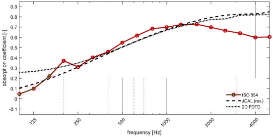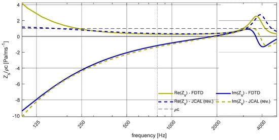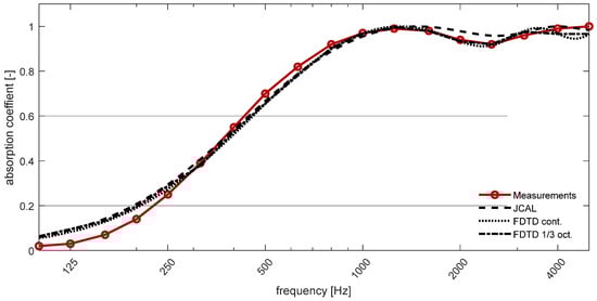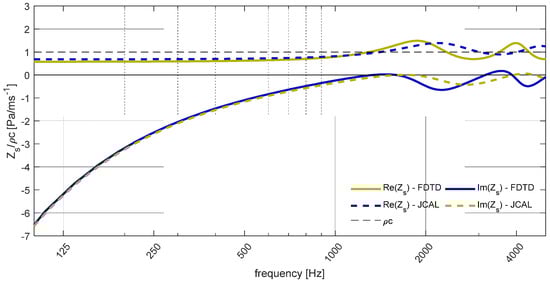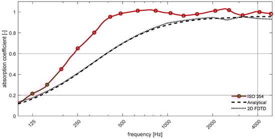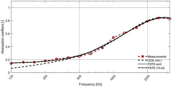 Figure 4 shows a normal absorption coefficient resulting from the 1D FDTD simulation scheme, which are, indeed, very similar to the measured ones. Below 315 Hz, there is an overestimation of sound absorption with a maximum deviation at 125 Hz of 0.06. Variation could be due to the fact that normal incidence measures below 315 Hz may have an inherent error caused by the tube length. As far as the authors’ knowledge, no setup conditions were presented in Reference [37]. In addition, a mismatch is noticeable at 4 kHz and 5 kHz. This particular error can be accounted for the one third octave band average done to the FDTD continuous values. As perceived, averaged values cannot follow the continuous ripple, and so certain values are lost, yielding a flat sound absorption response from 3150 Hz to 5000 Hz, which would not exist in the original FDTD calculation. Figure 5 presents the normal incidence surface impedance, where it can also be seen a good agreement with the analytical result calculated with the JCAL model. At high frequencies above 2 kHz, there is a slight deviation with the 2D FDTD results, which can be accounted for two reasons: (a) In Figure 4, normal incidence sound absorption is also a mismatch at the 2 kHz band, which increases the absorption, meaning that the impedance should be also higher. (b) The FDTD method dispersion could deviate these peak frequencies. At low frequencies, the material is purely reactive and capacitive, similar to an electrical open circuit, where voltage (pressure analogous) is maximum and no pressure drops through the material. Diffuse sound absorption is presented in Figure 6. It reflects a strong similarity with the analytical data. As well as for 1D FDTD results, there is a deviation at high frequencies. However, the total error made is insignificant. At low frequency, the comparison holds, differentiating from the 1D model because it takes into account different angles of incidence, and therefore, the absorption coefficient final response is smoothed all over.