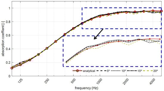 As previously explained, random incidence sound absorption is calculated using Paris’ integration formula with a selected range of angles. As a consequence, the angular step may affect the final result. Figure 10 presents diverse integration steps in the range [0–90°]. As Paris’ equation has a sinusoidal term in it, angles of 0° and 90° have no weight when diffuse field absorption is calculated. Given this circumstance, 0° and 90° simulations were not computed, thus saving computational time. The figure illustrates the effect of adopting different angle steps in the estimation of the random incidence sound absorption, clearly showing that a 10° step is enough to accurately perform this calculation.